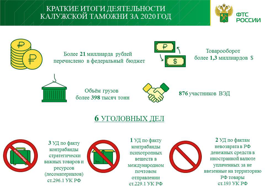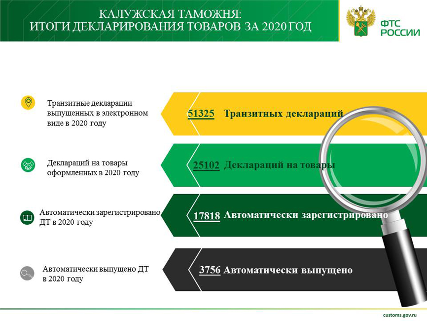 «В 2020 году мы работали в условиях реформирования системы таможенных органов, в соответствии с которыми Калужская таможня стала таможней фактического контроля. Компетенция таможни по регистрации и выпуску деклараций на товары ограничена» - сообщил начальник Калужской таможни Дмитрий Макаров. – «В связи с этим, основными задачами Калужской таможни являются фактический контроль товаров, работа с процедурой таможенного транзита, контроль после выпуска товаров и пресечение правонарушений в таможенном органе, в том числе и на внутреннем рынке» - добавил Макаров.