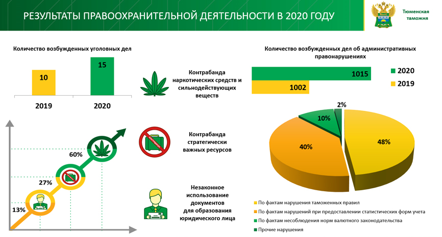 По фактам контрабанды наркотических средств и веществ (ст. 229.1 УК РФ) возбуждено 209 дел. Из незаконного оборота изъято более 622 кг наркотических средств, психотропных веществ, их прекурсоров, а также более 182 кг сильнодействующих веществ.