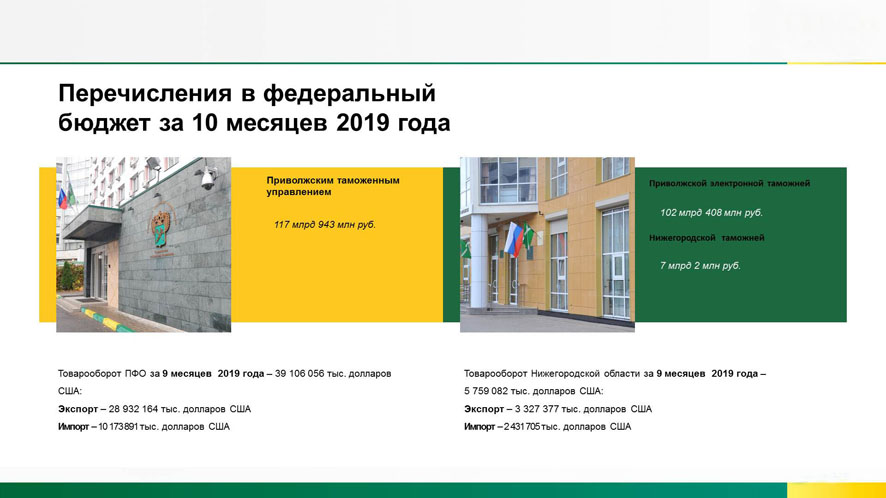 Внешнеторговый оборот в регионе деятельности СЗТУ за январь – сентябрь 2019 года по сравнению с аналогичным периодом прошлого года уменьшился на 5,2% и составил 47 млрд 693 млн долларов США. Объем экспорта составил 15 млрд. 594 млн. долларов США, импорта – 32 млрд. 99 млн. долларов США. Экспорт уменьшился на 10,2%, импорт – на 2,6%. Соотношение стоимостных объемов экспорта и импорта в товарообороте составило 33%: 67%.