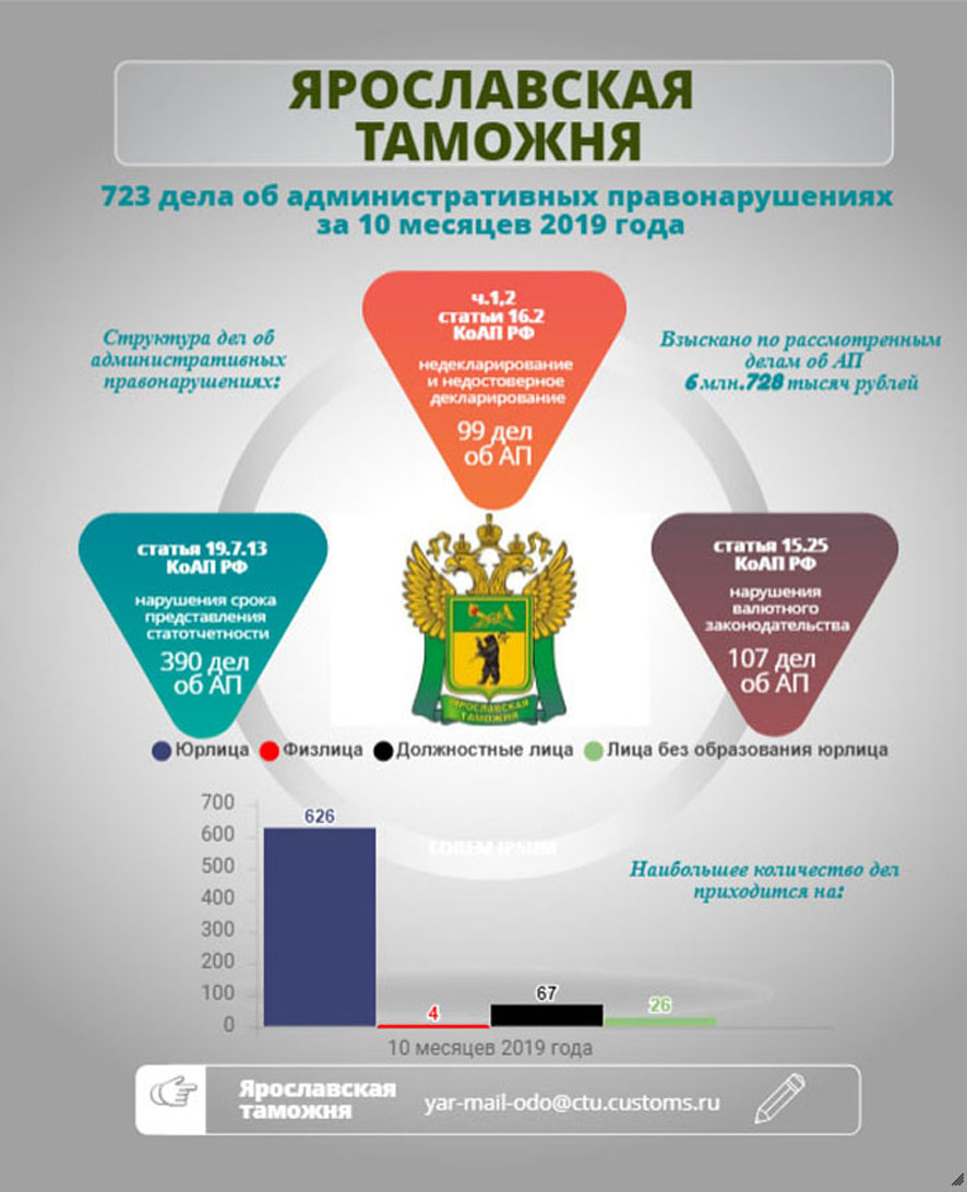 По итогам правоохранительной деятельности за этот период возбуждено почти 1400 дел об административных правонарушениях, что на 42% больше по сравнению с аналогичным периодом прошлого года. Общая сумма взысканных административных штрафов составила порядка 2 млн рублей. Возбуждено 6 уголовных дел, 4 из которых – по фактам уклонения от уплаты таможенных платежей. Сумма уклонения от уплаты таможенных платежей составила более 9 млн рублей.