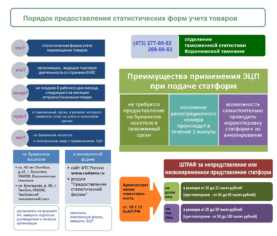 Саратовская таможня обращает внимание на обязательность и своевременность подачи статистической формы учета перемещения товаров. Статья 19.7.13 КоАП РФ «Непредставление или несвоевременное представление в таможенный орган статистической формы учета перемещения товаров» предусматривает для участников ВЭД административные штрафы от 20 до 50 тысяч рублей.