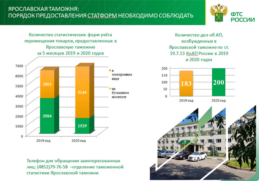 По вопросам, связанным с исполнением обязанности представления статистических форм, заинтересованные лица могут обращаться в отделение таможенной статистики Ярославской таможни по телефону (4852)79-76-58.