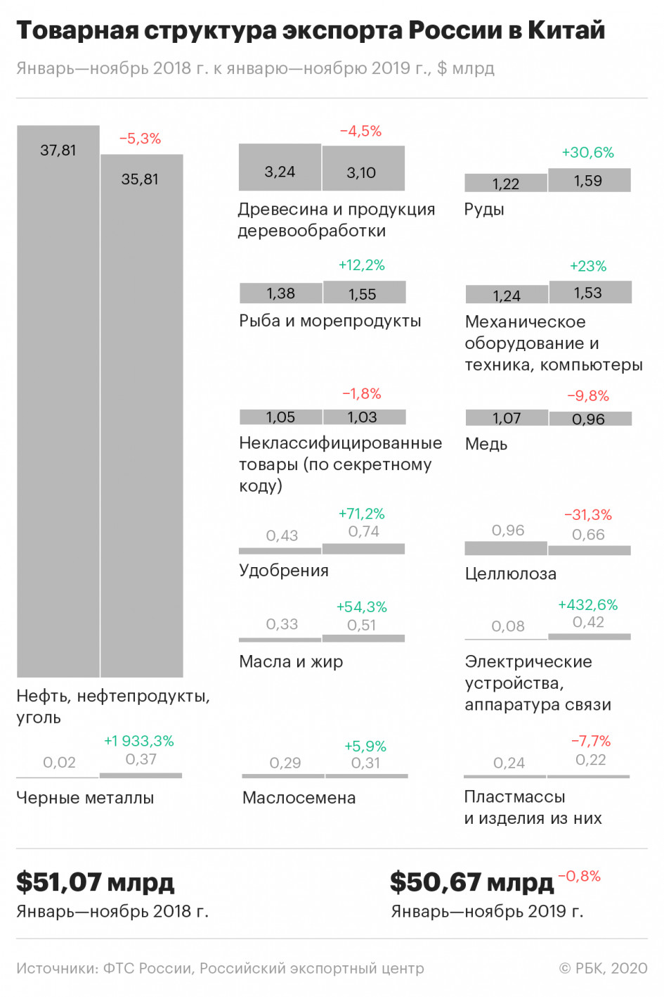 За январь—ноябрь 2019 года объем товарного экспорта в Китай, по данным ФТС России, составил почти $50,7 млрд — практически столько же было за аналогичный период годом ранее. За первые три квартала Россия экспортировала в Китай по $14–15 млрд товаров и услуг, следует из агрегированных данных ФТС и ЦБ.