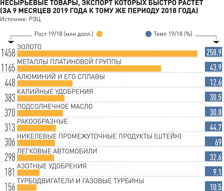 Хотя август важен для понимания направления движения экспорта, говорить о вероятном переломе его динамики можно будет по данным минимум трех кварталов. Пока же даже оценки Центра развития ВШЭ свидетельствуют, что за восемь месяцев (август 2019 года к декабрю 2018 года) внешнеторговый оборот уменьшился на 4,2%, экспорт — на 7,3%, импорт увеличился на 1,7%, а положительное сальдо торгового баланса сократилось на 17,3%. При этом внешнеторговый оборот со странами ЕC снизился на 6,9%, с Китаем — на 1,9%, с США — на 2,1%. «Динамика экспорта обусловлена главным образом динамикой цен на мировом энергетическом рынке. Падение мировых цен на нефть в ноябре 2018 — августе 2019 года (на 25,1%) стало причиной уменьшения объемов экспорта. На динамику импорта продолжали влиять спросовые ограничения на отечественных рынках товаров потребительского и инвестиционного назначения»,— поясняют авторы исследования. На этом фоне за первые восемь месяцев 2019 года экспорт высокотехнологичной продукции увеличился на 23,9%, а ее импорт — около двух третей общего объема импорта — сократился на 0,3%.