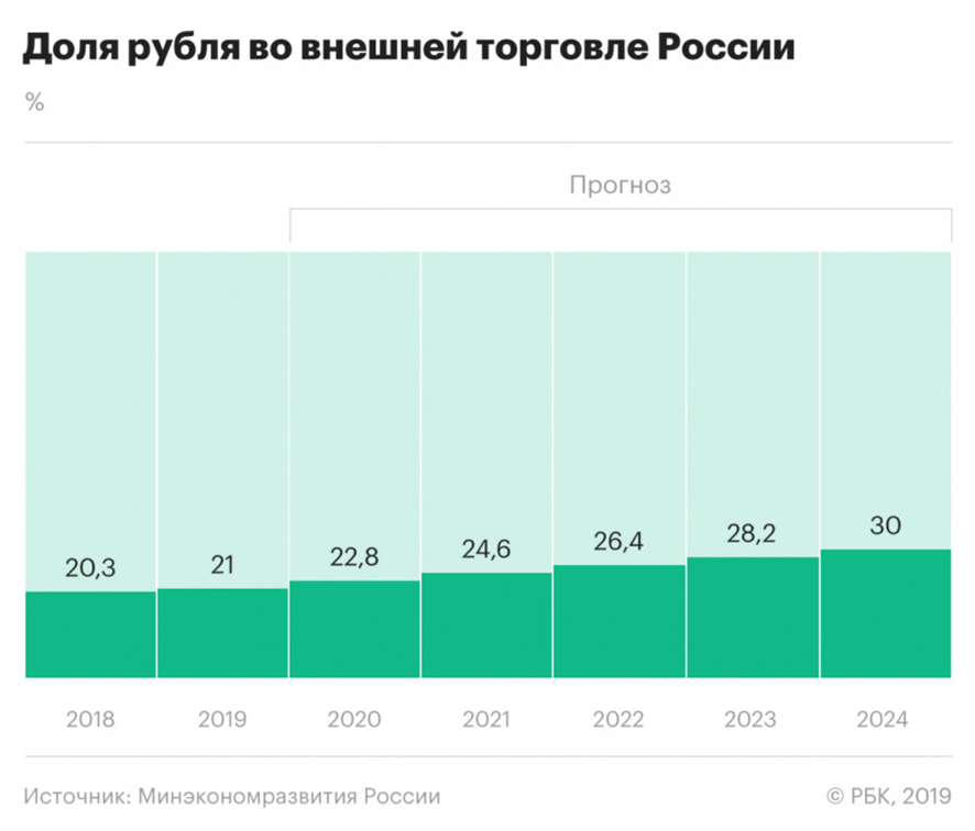 План Минэкономразвития означает, что к 2024 году рубль сравняется с долларом и евро по доле в российской внешней торговле или опередит одну из этих валют (по всей вероятности, постепенно теряющий свои позиции доллар). В 2024 году внешняя торговля России товарами и услугами в эквиваленте по меньшей мере $300 млрд будет вестись в российских рублях, следует из предложенного министерством KPI.