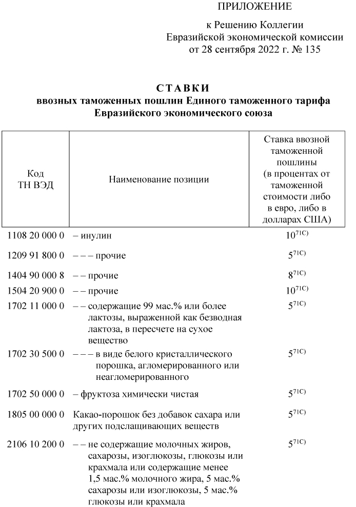 Решение № 135 от 28-09-22, Об установлении ставок ввозных таможенных пошлин Единого таможенного тарифа Евразийского экономического союза в отношении отдельных видов товаров, ввозимых на таможенную территорию Евразийского экономического союза в целях обеспечения устойчивости экономик государств – членов Евразийского экономического союза